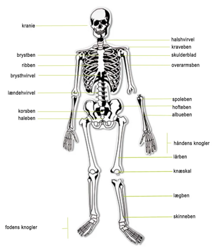 Det menneskelige skelet - forfra - med navne på udvalgte knogler